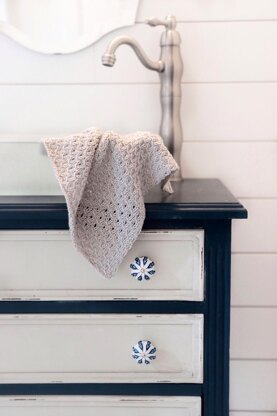 "Subtle lace combined with easy slip stitches create a fresh and modern texture for this towel, making it a lovely décor accent for any bathroom or kitchen."