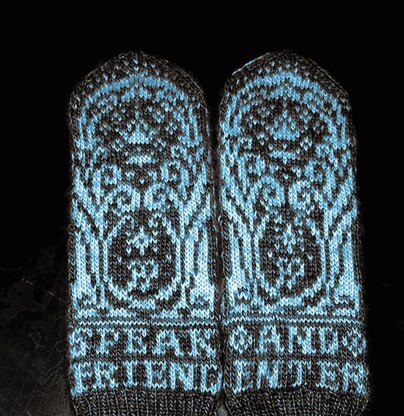 This pattern is based on J.R.R. Tolkien's drawing that was also used in Peter Jackson's movie. According to the book, the Gates are only visible under the moonlight; that's why I used light yarn on dark background for the first sample pair (and that's how the pattern is charted). However, you can also knit it dark on light, just like in the Tolkien's drawing ;-)) .