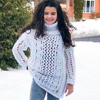 The pullover stitches are divided into sections starting from both sides; ribbing, cabling, threading and meeting in the centre with a lace section.