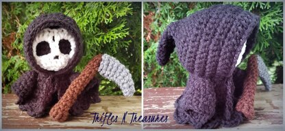I am striving for ways to make darker things fun and cute...The Grimm does just that! He's still a little creepy and somber, but isn't he cutejQuery2140669535407066729_1600675059315 He measures in at just 6" tall, and he's actually quite cuddly ❤️ He just wants to come home with you and make new friends! He's even willing to decorate Instructions include the basic doll, his hooded cloak, and his little scythe...