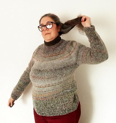 Gomitolo Maya is a patterned, gradient yarn from Lana Grossa. I plumped it up with a strand of light gray Brushed Alpaca Silk by Drops and knitted it at a quite loose gauge for a light and fluffy sweater where the color variation remains muted. While knitting I tried to match the shades of the yarn to create a uniform gradient across the sweater. The garment is knitted seamlessly top down with round yoke.