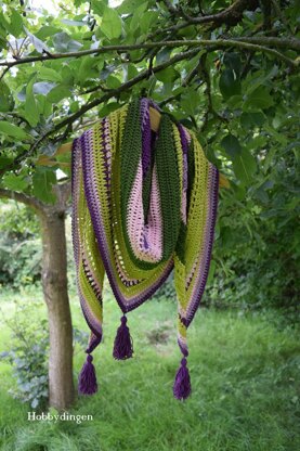 The Holiday Shawl is a triangle shaped shawl made with simple stitches, and fun row and color repeats. Use yarn with cotton, acrylic or bamboo to create a shawl for the summer and use yarn with warmer colors and wool for a shawl to wear during the colder seasons. You can easily adjust the size of the shawl by crocheting fewer or more rows.