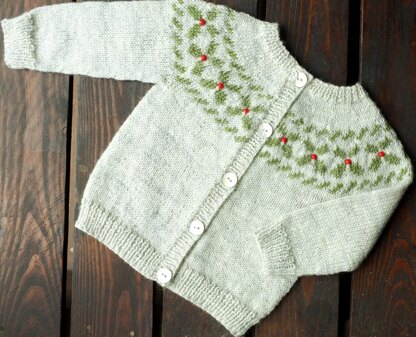 The Holly cardigan is knit top-down and has three sizes: 3, 6 and 12 months. There is a chart for the holly design.