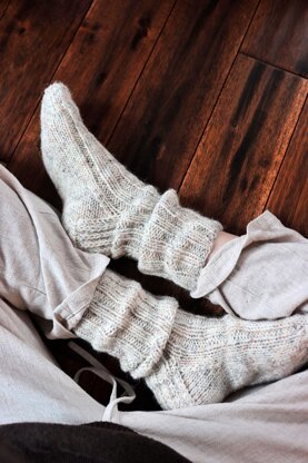 "Classic all-over ribbing and worsted-weight yarn makes The House Socks the ultimate socks/slippers to cozy up with while lounging at home. Designed with wear in mind, the sturdy heel makes these ultra comfy socks durable and a true delight to knit."