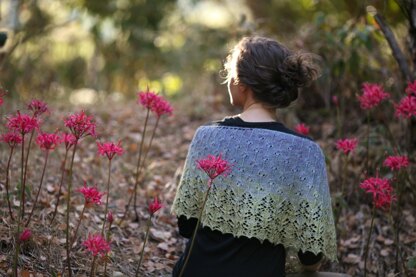 The shawl suits lace to sport weight yarn (choose needle size to suit your yarn/gauge preference), in solid, gradient or very gently dappled colour such as the gorgeous Gobsmacked dappled gradient I used.