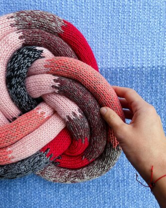 The infinity cushion is made from different yarns from my stash. I knitted a rope and braided it into the cushion.