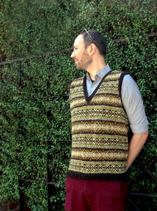 This is a pattern for a Fair-Isle style slip-over/tank/vest. It is worked in the round and from the bottom up. The neck and armholes are worked with steeks. After the steeks have been prepared and cut, the neck and armhole ribbing is worked.