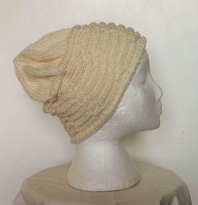 One size unisex knitted hat with a slight slouch. Brim is knitted first, then the crown picked up. Brim can be knitted as an earwarmer/headband by omitting the crown. 100gms of yarn 1 pair of 5mm needles wool/tapestry needle for sewing up seam.