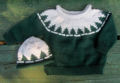 The Larches is worked top down in the round with short row shaping along the back neck. The pattern has a chart. There are 5 sizes: 3 months to 3 years.