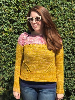 The Mary Pullover is the PERFECT project for your fall knitting list. This breezy, chunky/bulky weight pattern knits up super quick while giving you the chance to play with color blending, basket stitch and eyelet seaming! The entirety of this pattern is knit with one strand of fingering/sock weight yarn and one strand of chunky/bulky yarn held double. This creates a “marled” look for your sweater and gives it some extra dimension! This sweater is also completely reversible. I like to rock my reverse stockinette side!