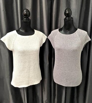 Worked in the round, this top makes a simple knitting project. It's a classic design, with an easy to memorize knit, purl stitch pattern. The four row stitch pattern is both written and charted for ease of use. Optional waist shaping instructions are included for those who would like a more figure hugging fit. The edges are trimmed with garter stitch bands. Two yarn choices are provided in the instructions. One is a robust cotton with sheen and the other a Rayon based yarn with a metallic fleck which drapes beautifully.
