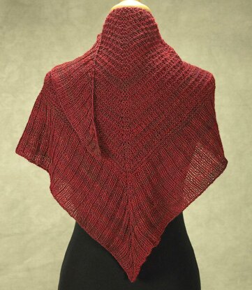 This triangle scarf is worked with a top down construction technique. It uses an extra set of increases at the edge to create its unusual shape. Some knitters call this a heart or boomerang shape. The extended points can be used to wrap around the wearer’s neck. The stitch patterns are reversible. The main body stitch pattern is created with a simple knit purl combination. Stitch patterns appear in text and as a chart so the knitter can work from whichever format they prefer. The edging is simple 2 x 2 rib.