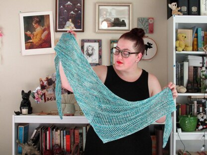 The Ocean’s Daughter is a lightweight, one-skein shawl consisting of two eyelet patterns and garter stitch. Using only basic stitches, it is knit on the bias, and is an ideal choice for a portable project.