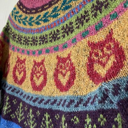 The Owls Club is worked seamlessly from the top down. Short rows are added to shape the neckline and the stranded yoke is worked. The design continues under the sleeves with the row of trees. The sleeves and body are separated and worked in the round and finished with a ribbed hem.