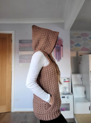 Hey everyone and welcome to The Pixie Pullover! This design is made from aran/worsted weight yarn. The vest is oversized, loose fitting and super cosy, perfect for teaming with leggings on a chilly day. The hood and pockets are optional but definitely add some extra snuggleness. I look forward to seeing everyone’s version of The Pixie Pullover!!!