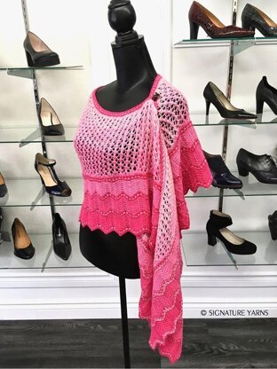 This elegant long crescent wrap with its shallow depth is the perfect cover-up. The design includes simple chevrons and lace in a changing palette of gradient colours. A slip stitch pattern borders each section. It is a project easy enough for the beginner lace knitter. The lace section has only 2 pattern rows and the wrong side rows are purled. The lace section is created using easy short rows (no wraps) worked outside the lace, which give the piece its crescent shape. The wrap is knitted in one piece starting at the bottom edge. The stitch patterns are written in text only, due to the simplicity of each stitch pattern.