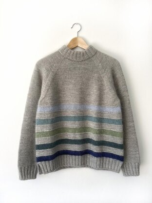 The sweater is knitted in the round using stockinette stitch interspersed with round of purl stitches before and after the stripes. To knit the sweater, firstly stitches are cast on for the collar which is knit in 2x2 rib and folded to create a mock-neck. The yoke is knit in the round and shaped using raglan increases. The sleeves and body are then split and stitches cast on at the underarm. The body is knit in the round and five stripes are created before finishing with a 2x2 rib split hem which is slightly longer at the back than at the front. The sleeves are picked up and knit in the round, decreasing at regular intervals to create tapered shaping and the cuffs are finished with 2x2 ribbing.