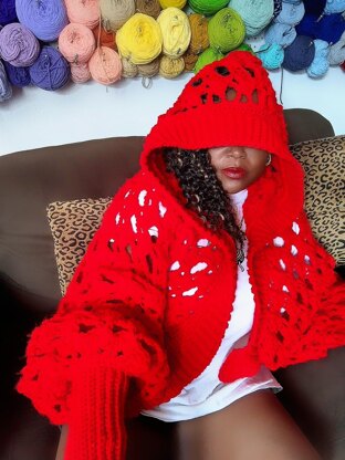 Made in our vivacious Ruby Red yarn, this cardi is made up of simple and easy crochet stitches. This is an easily customizable piece to suit your body size. The sleeves are made to be baggy, dramatic, & oversized. The cardi is about 22ins in length, but can be shortened or lengthened depending on your personal preference.