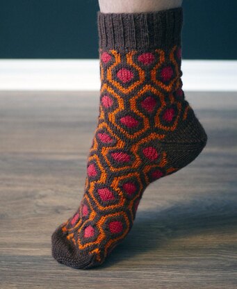 The iconic carpet from The Shining in sock form! At an intermediate difficulty level, these socks are knit from the top down and designed with an afterthought heel to make the stranded knitting as painless as possible. You’ll be reaching for these cozy socks not just for Halloween, but all season long.
