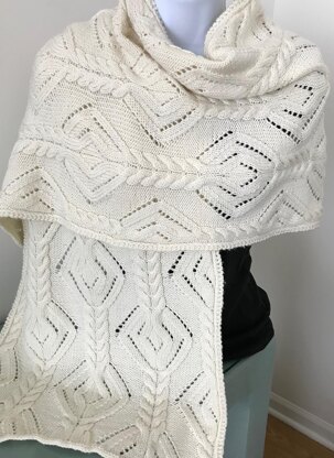 The Sunderland design, with its cables and lace, can be knitted as a rectangular wrap, wider shawl or stole, as well as a wide scarf. The pattern has two slightly different options: a 4-stitch cabled version with center slipped stitching, and a 6-stitch wider cabled version without the center slipped stitching.