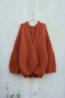 The Sunset cardigan is an oversize piece with long balloon sleeves, reaching just below the hips. It's designed to be simple to knit and comes without shoulder seams - it means the back and front are all knitted as one big piece. The cardigan front band is then worked after finishing the main body section, as are the sleeves. It also features two side seams for added style, making it a fashionable choice for beginner knitters who want a cardigan that will go well with different looks both at home and outside.