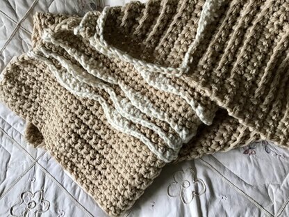 Unique design in The Telluride Throw. Ripples of chunky white yarn crocheted atop the sumptuous, warm, chic throw. Fits any decor in any room. Completely reversible. Simple crochet stitches throughout. CARON BRAND ONE POUND YARN USED IN THIS PATTERN AND LION BRAND WOOL EASE YARN.