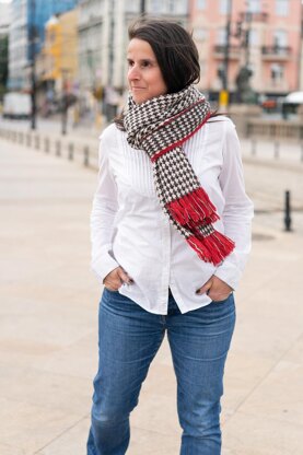 “The Thin Red Line” is a rectangular shawl, worked from side to side in long rows in a very easy stitch pattern. This is a very relaxed project that does not require counting and takes just a bit of attention. Two contrasting main colors and one additional different (again contrasting) color are used. Color is changed at the end of each row, leaving the tails, which are later incorporated inside the fringe.