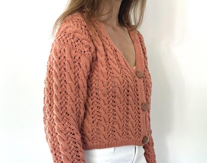 The Vacation Sweater is a combination of cables and open stitch work. The cropped V neck cardigan style turns a basic shape a little more modern. You can add length if you choose.