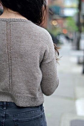 This piece found its name because of the small detailing that looks like a vertebrae traveling up the back of the sweater. It features a slightly cropped, drop-shoulder style with a V-neck and includes about 4”/10 cm of positive ease. The hem, cuffs, and neckline feature clean, twisted ribbing. The sweater consists of a bottom-up construction – knitting in the round until you split for the armholes, then seaming at the shoulders. The sleeves are then picked up and knit down to the cuff. A final touch will be picking up and knitting the neckline. I hope this becomes one of your favorite sweaters (as V-necks are my absolute go-to). Happy knitting!
