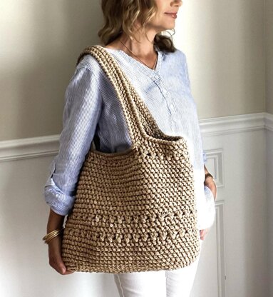 This pattern was first published in Homespun Magazine. Perfect for your next getaway, the Weekender Bag is an easy crochet pattern that works up quickly with a double strand of Lion Brand Rewind Tape Yarn and a 9 mm crochet hook. I have include a full YouTube tutorial in the pattern for making the bag. I have also included photos in the written pattern that demonstrate how to make the leather tassel.
