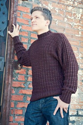 The sweater features a boxy silhouette with modified drop shoulder sleeves, and a simple ribbed collar. The sweater is knit flat in pieces, seamed together, and then the neckband stitches are picked up and knit in ribbing. The body is worked in an easy textured knit/purl stitch. The sweater features modified dropped shoulders, with slightly set-in sleeves for a slightly less bulky look.