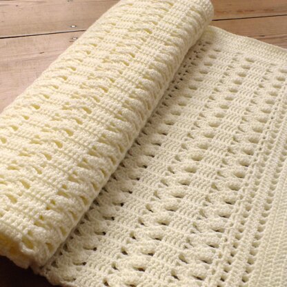 The blanket is worked in soft 4ply baby wool and is a great size to use as a wrap or shawl or a pram cover. This would make a wonderful gift for a newborn or perfect as part of a christening outfit. The finished blanket measures 90cm by 90cm.