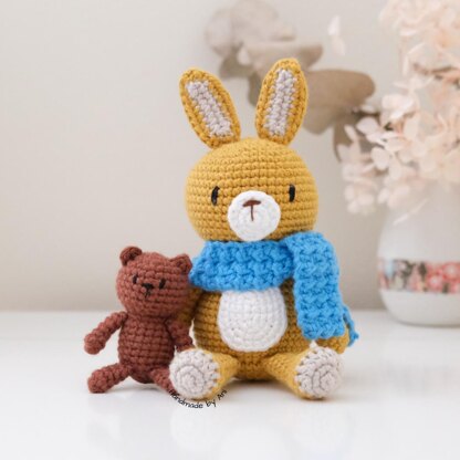 The finished bunny ends up approximately 13cm tall (when sitting down) using similar yarn and hook size. Thinner yarn and a smaller hook size will produce a smaller toy and vice versa.