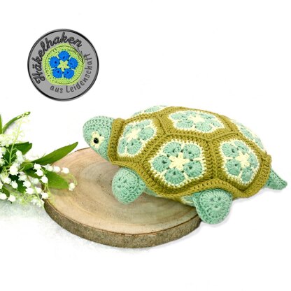 Thilda is a small pillow in the shape of a turtle. It is crocheted with 25 African Flowers in different sizes. You can also make it a heat pad by placing a grain pillow inside.