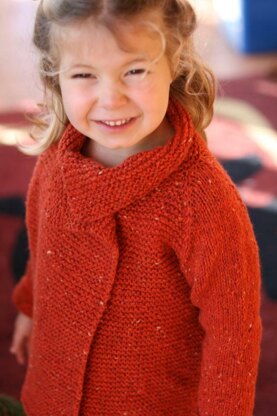Simple and stylish, this cardigan can be worn open with a draped front or crossed over and buttoned to stay cosy. Knitted from the top down in one piece, this cardigan is fast to knit with minimal finishing. A wide range of sizes make this a great knit for girls of all ages.