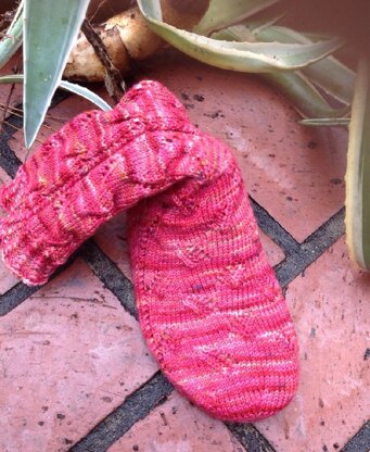 A 4-stitch braided ribbing is worked up both sides, on the heel flap, and cuff. The instep and leg are worked in an easy YO lace work pattern which is great for beginning lace knitters. Directions include options for tapered or rounded whirlpool toe styles and generic or calculated foot length. This pattern is a quick knit and travels well.