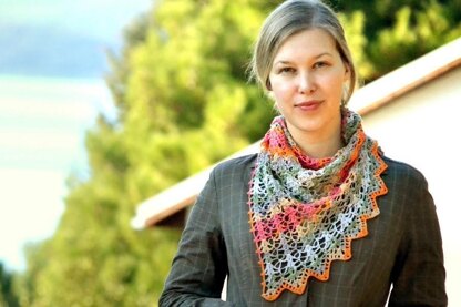 General Construction Thistle Field is an asymmetrical triangular kerchief with unusual shaping. It is worked sideways, starting from a corner. A wide edging is worked along one side and a narrow picot edging is added on the other two sides.