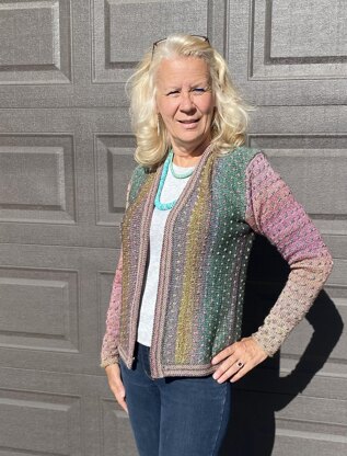 The pattern is easy to follow, done side to side starting with the back at the armhole, increasing to full body, and continuing to the decreasing of the armhole on the other side. V-neck makes it a flattering cardigan. This yarn is a joy to work with