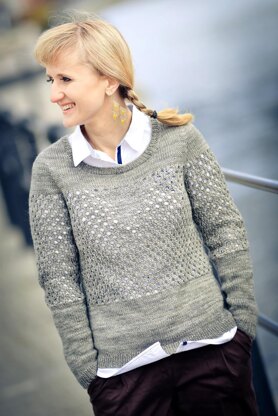 All friendships are knit together metaphorically, but knitting buddies are truly joined by a common interest in yarn – pieces of string which bind our lives together. Threads, a comfortable-fitting pullover, was inspired by a comfortable-fitting friendship – you know the kind – where you can chat for hours about anything or nothing, deep or shallow, intricate lace or stockinette, while your busy needles hum a steady, comfortable rhythm in the background.