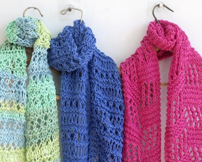 Three easy knitting patterns for cotton scarves in pretty lacy patterns. Light weight scarves for spring, summer and fall or fashion accessories all year. The patterns work up quickly.