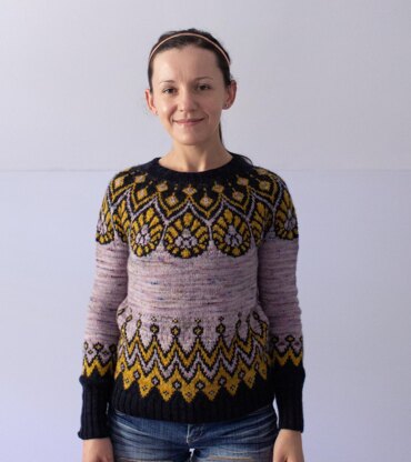 Throne is a round yoke pullover featuring interesting stranded colorwork designs. Inspiration for this design came from a throne, a crown, and everything royal!