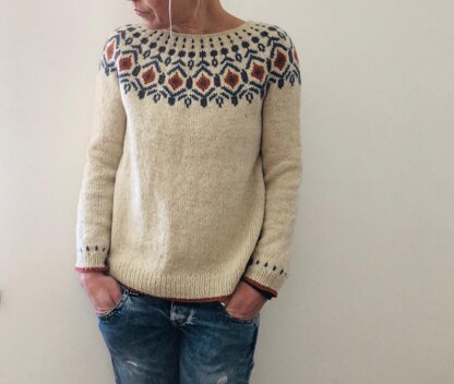 Tiberius is worked seamlessly from the top down. First some short rows are worked back and forth to create a higher back neck and then the yoke is worked in the round to sleeve separation. Some last short rows are worked to finish the yoke shaping right before sleeve stitches are placed on hold. The body is then worked in rounds down to the hem. Sleeves are worked top down to the cuffs last. Optional neck finishing is worked last.