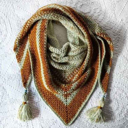 DK weight triangle shawl worked from top to tip, fading and striping yarns together. Optional beaded tassels, with tutorial included.