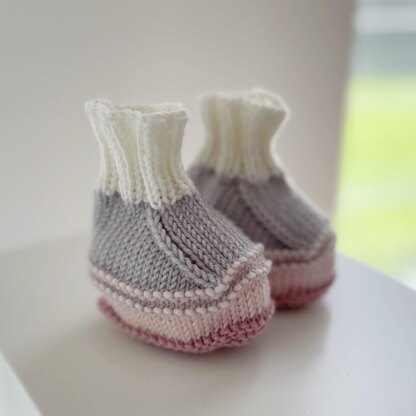 These booties are a great way to use up leftover fingering weight (4ply) or light sport weight (5ply) yarn. They have thick garter stitch soles for added warmth, raised insteps and ribbed ankles to keep them on kicking little feet.