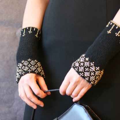 The cuffs are knit sideways in garter stitch with beads pre-threaded onto the yarn and inserted between stitches one by one. This beading technique does not require any special tools or skills, the only difficult part is getting the beads in the right order when stringing, so it’s a good idea to check yourself before you start knitting.