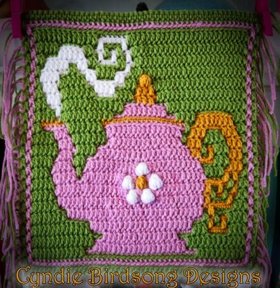 This pattern uses the overlay mosaic method & features a cute teapot with a flower made of bobbles, on a square shape project with a thin border, and would work great to use for pillows, place mats, tote bags, or in block afghans. Who doesn’t love a cozy morning in the garden, sipping a warm cuppa tea?