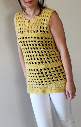 This striking mustard sleeveless lace top is the perfect garb on warm, summer days. It is crocheted using 100% 8ply cotton.