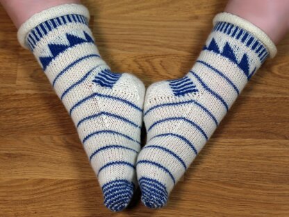 My all time favorite band since forever has a song called “A fine blue line” that I kept hearing in my head while working on these socks. A recurring line in the chorus is “Time marches / rushes / races on ahead”. The socks come in three sizes with just a tiny little bit of stranded knitting, so if you’ve been wanting to give that technique a try, I hope to encourage you with this design! Many thanks to my tech editor Michelle Hazell and my test-knitters… Any remaining mistakes are mine.