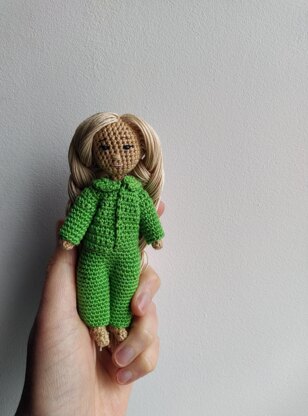 I'm happy to introduce to you a crochet pattern for a 5-inch doll that can bend its arms and legs and take on various poses (not for small kids!). The pattern shows how to crochet a realistic female body, how to prepare and insert a frame inside the crocheted body, and how to dress the doll in a cute green playsuit and black slippers. The clothes and shoes can be taken off and put back on the doll. The pattern also shows how to make the doll's hair. All that's left is to embroider the eyes of your choice (a couple of stitches of black thread symmetrically from the nose) and the mouth (one stitch of pink thread).