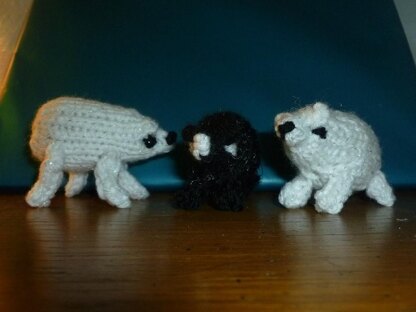 Here's a tiny toy bear, about 2.5 inches (6.3 cm) long, made with hardly any yarn at all. It's perfect to use up some scraps and then go on a key chain or a mobile, or be a Christmas ornament or cat toy. With larger yarn and needles, it could be made bigger, or smaller with smaller yarn and needles.